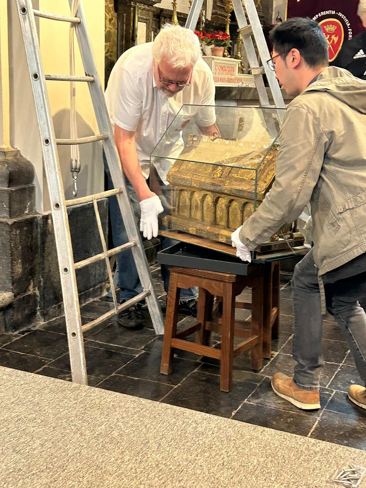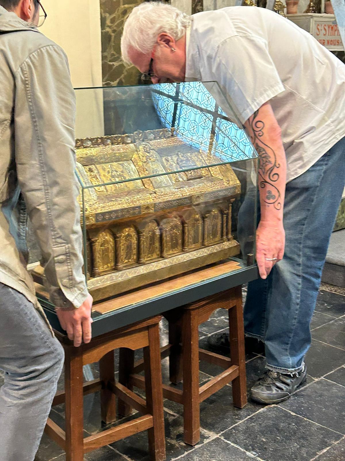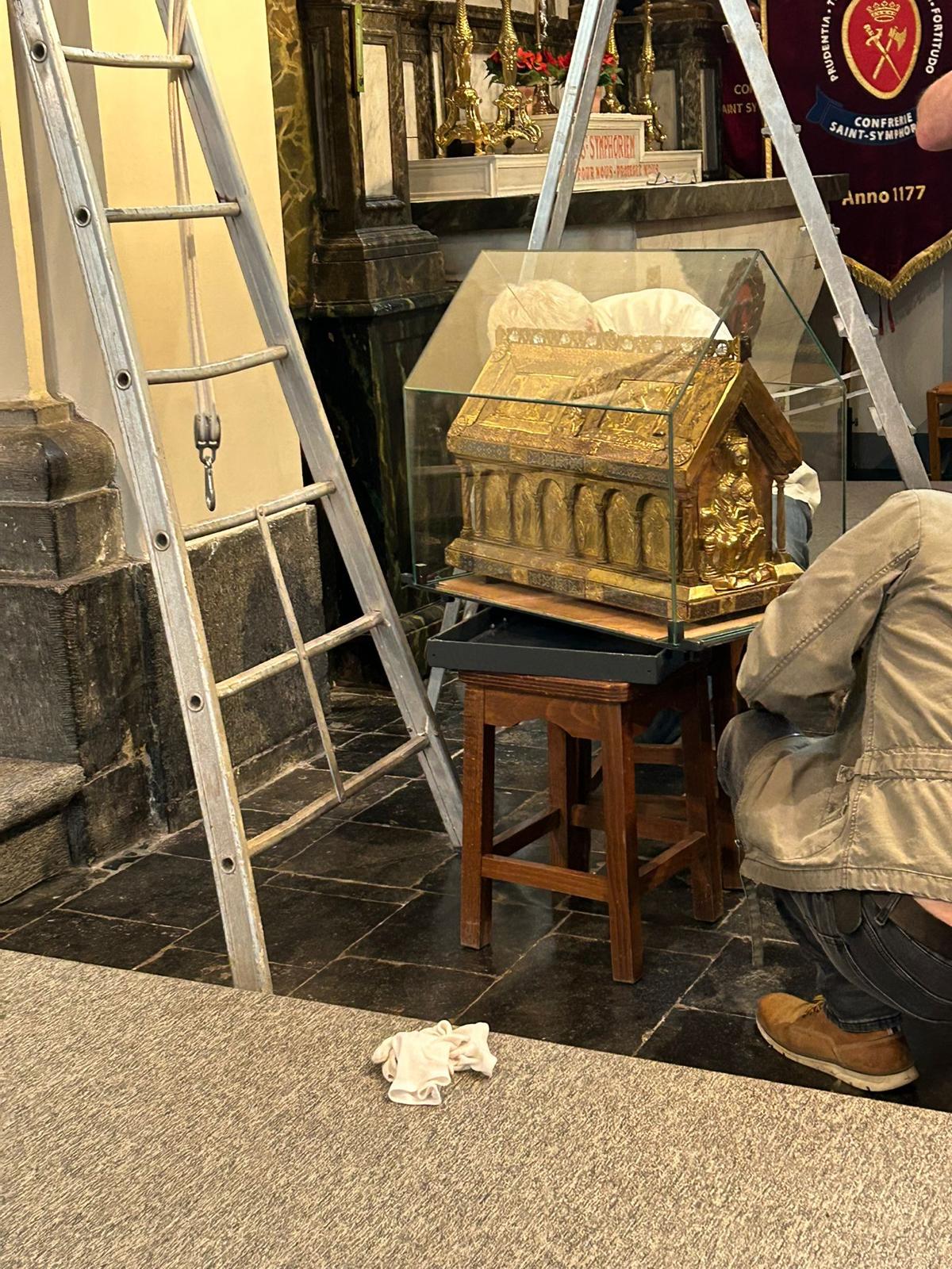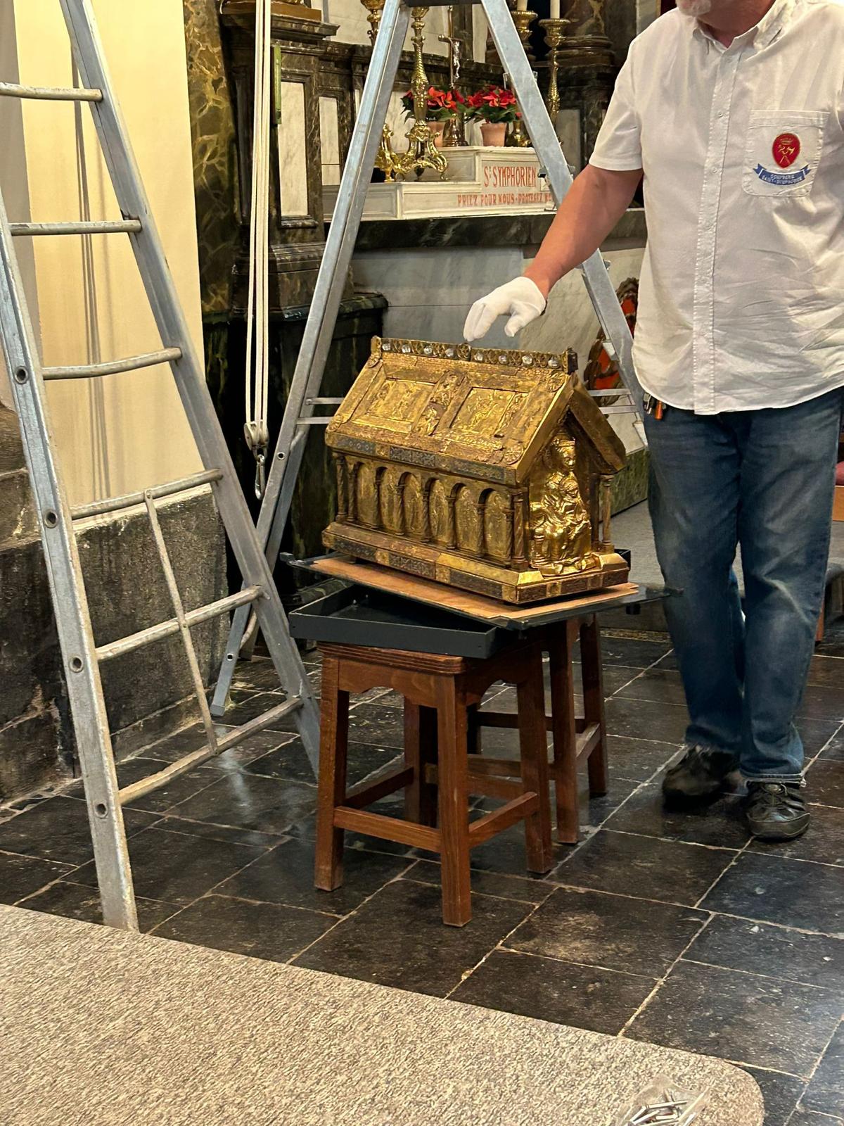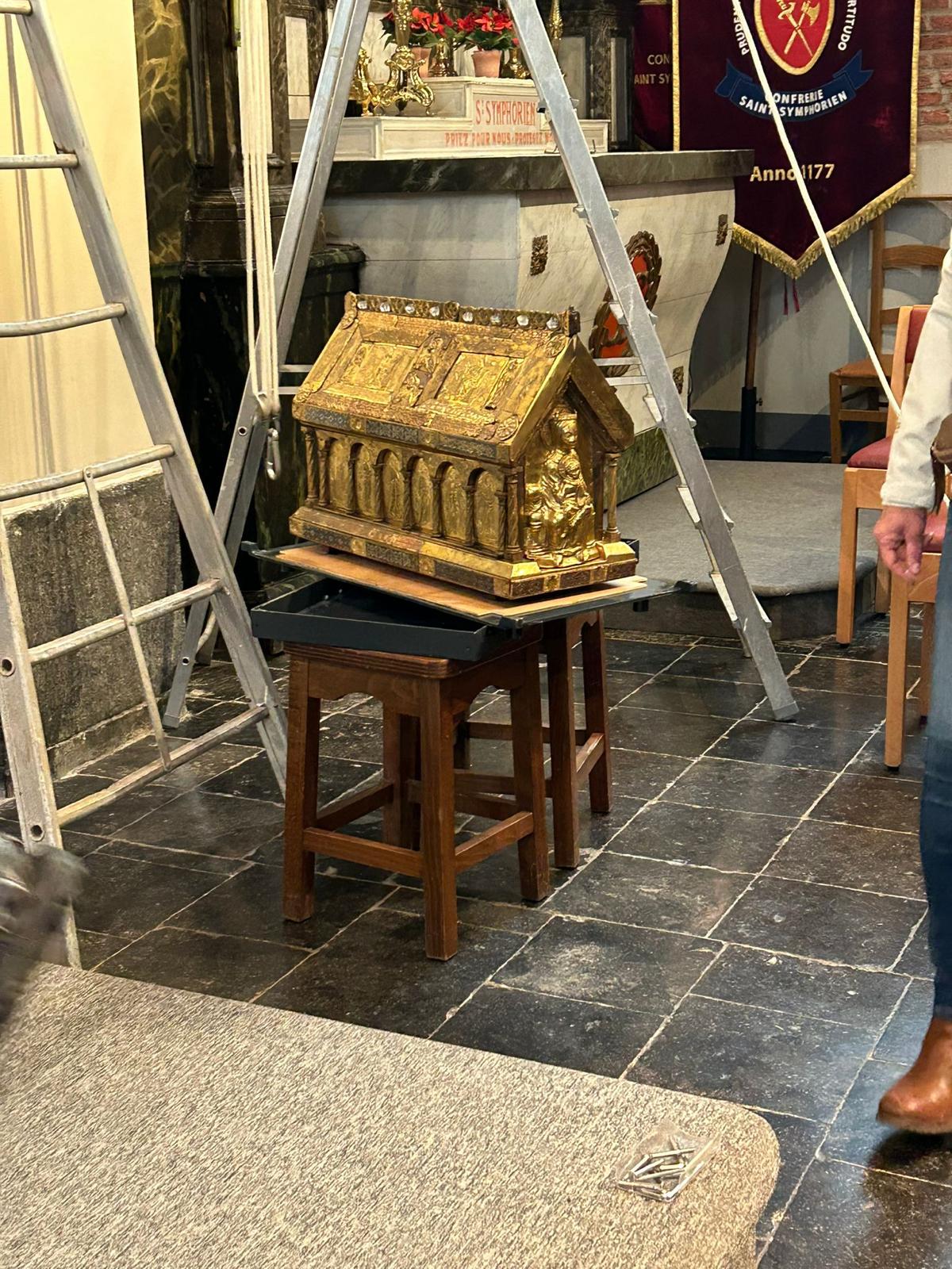 Après un séjour de quelques jours dans le trésor de Sainte Waudru pour participer à la procession du Car d’Or, la châsse de saint Symphorien était de retour en son église.