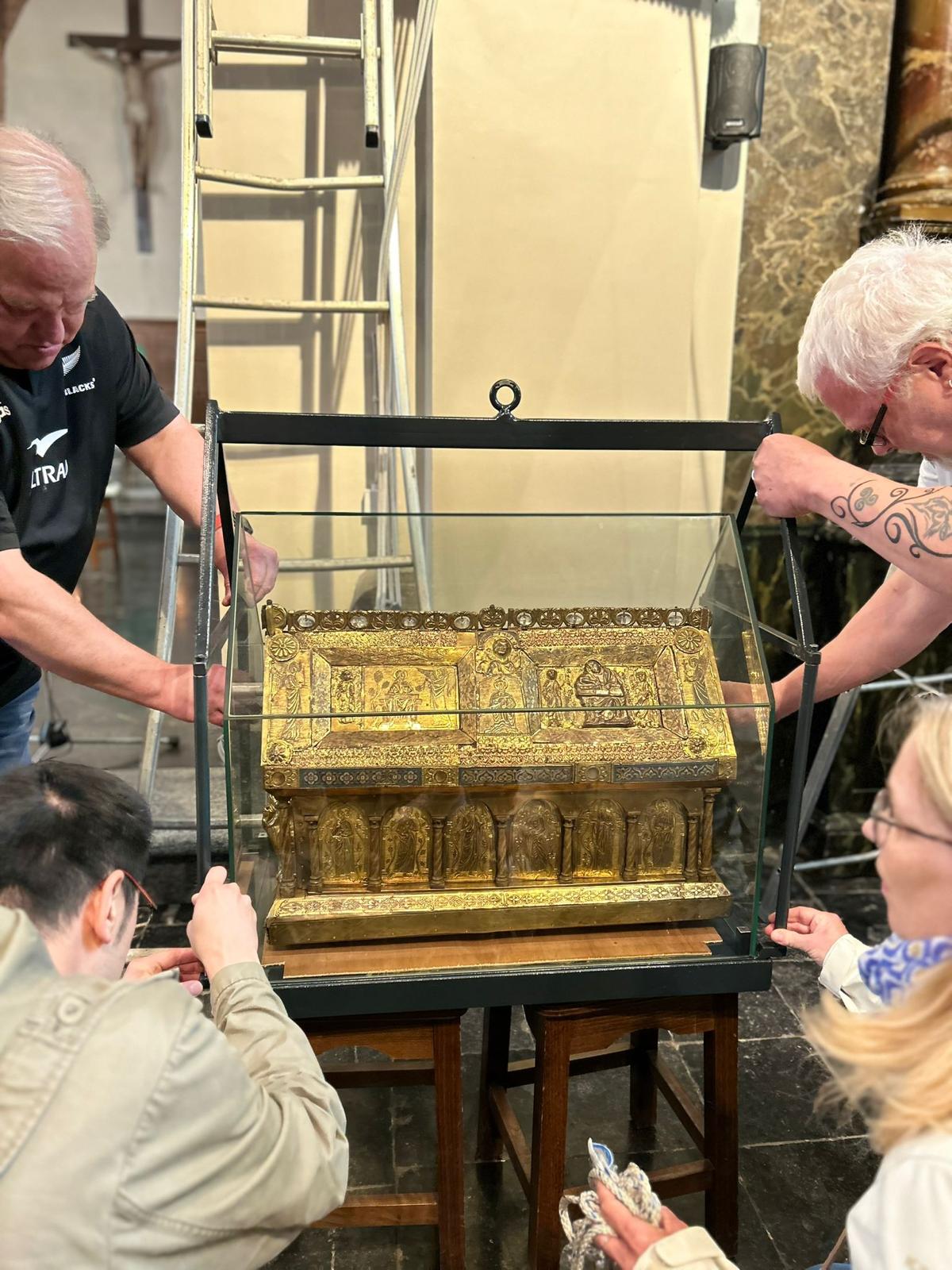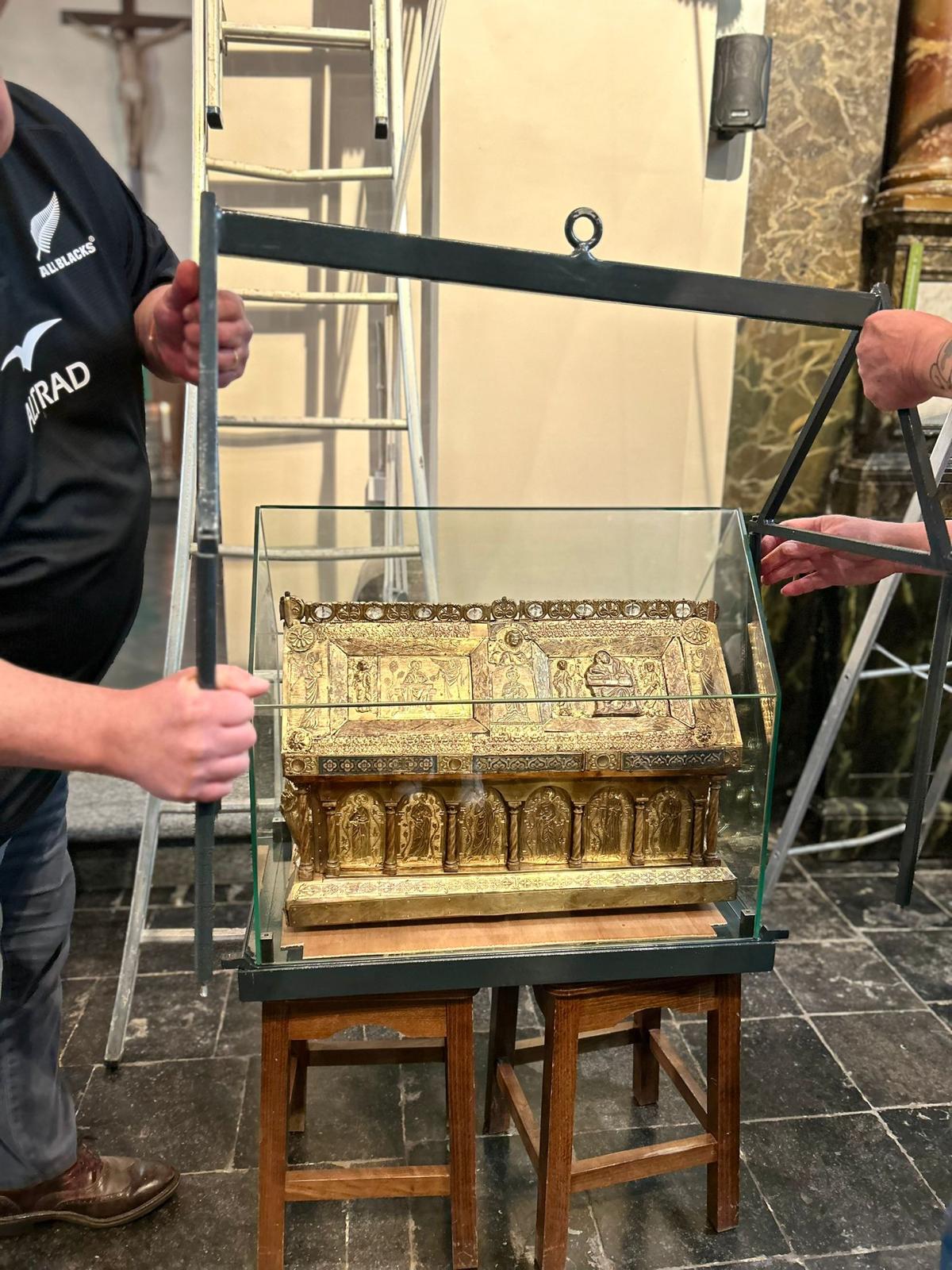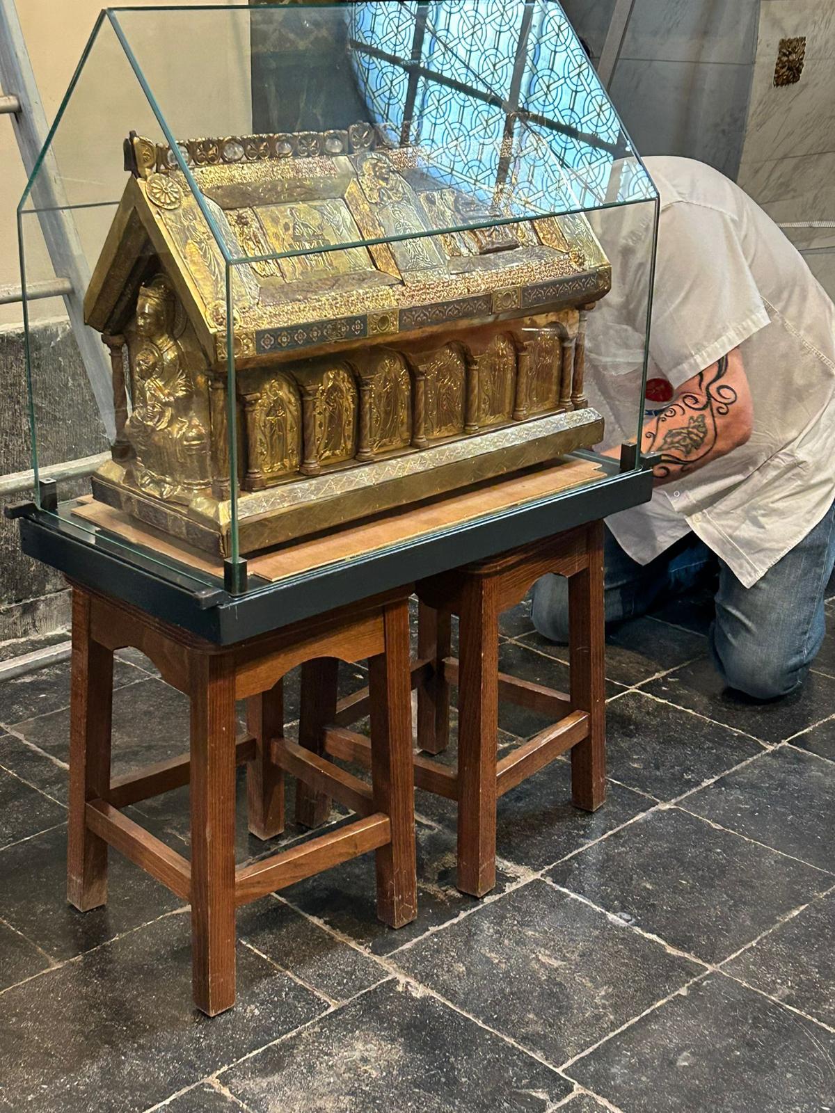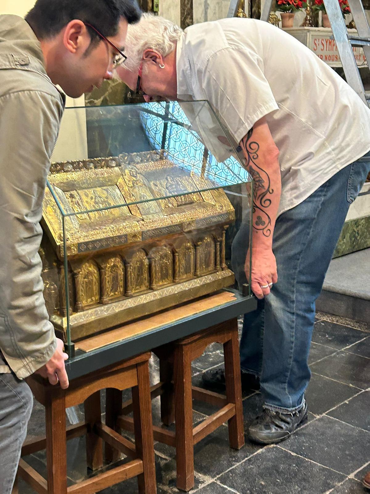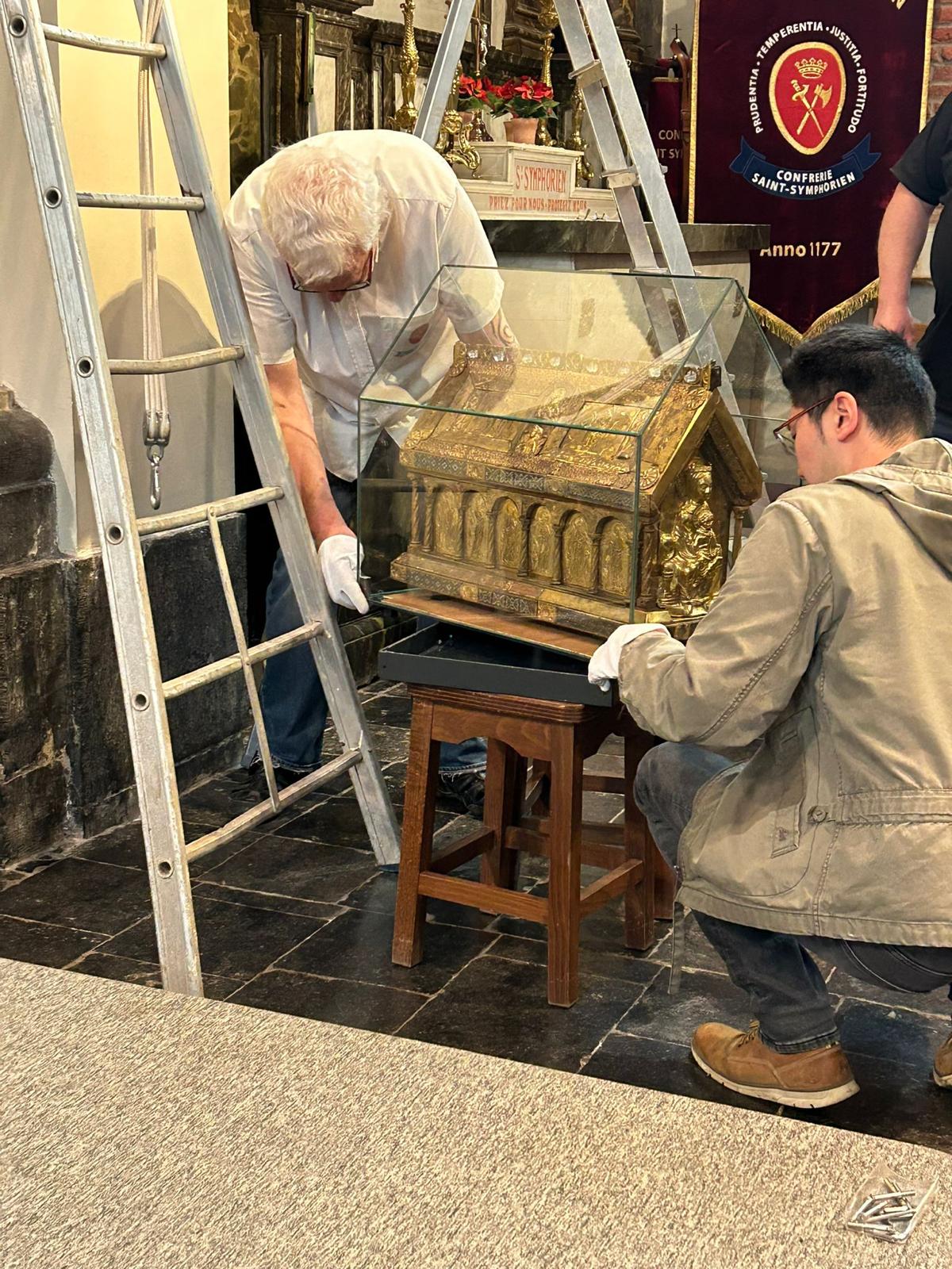 Après un séjour de quelques jours dans le trésor de Sainte Waudru pour participer à la procession du Car d’Or, la châsse de saint Symphorien était de retour en son église.